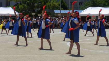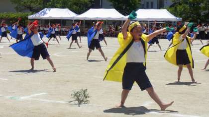 心も体も強くたくましく成長した3・4年生が,ソーラン節を踊りました。キレのある動きで,息のあったかけ声の勢いが圧巻でした。また,一人一人の演技のかっこよさはもちろんですが,集団としての隊形移動の動きも,とても見応えがありました。