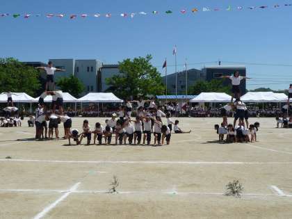 先日は運動会にお越しいただき、ありがとうございます。どの競技や演技にも、子どもたちは全力を尽くしていました。中でも「スタンツ・輝き」での心のこもった演技、そしてやりとげた晴れやかな表情からは、子どもたちにとって最高の運動会になったことが伝わってきました。一つ一つの演技の完成度が高まり、運動会当日が一番良い出来栄えとなりました。とりわけみんなで作り上げたフィナーレ「富士山、三段タワー、やぐら、波」は、見事に完成し、とても感動的なものとなりました。そこには、「絶対にたおれないぞ!」「最後までがんばるぞ!」という子どもたちの強い思いがありました。その思いの強さに、子どもたちの心の成長を感じます。今後とも子どもたちに、温かいエールを送ってくださいますよう、よろしくお願いします。