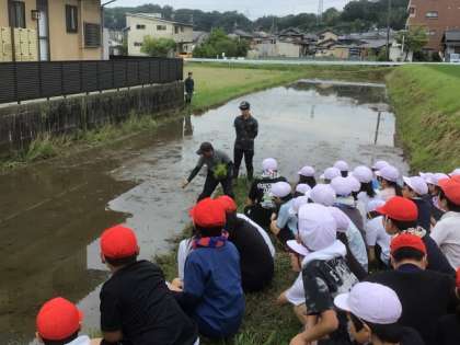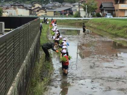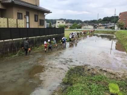 6/12は、地域の農業法人の方が田植えを教えに来てくださいました。稲の苗を束からとって、水田の泥の中に植えるこつを、児童は教わりました。スタッフさんが張ったロープに沿って児童は一列に並び、一斉に植えていきました。