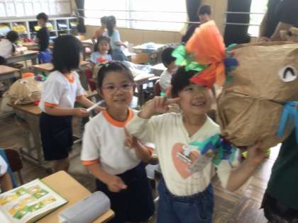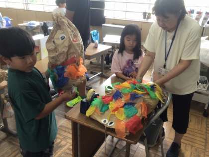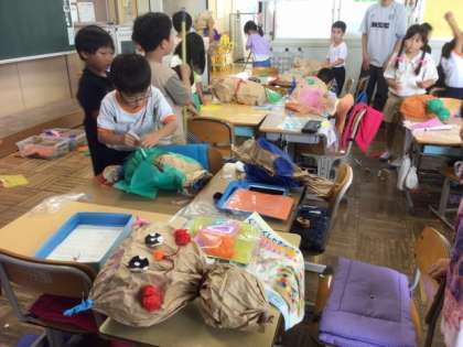6/16の授業では、丸めた新聞紙を茶色い紙袋に詰めてふくらまし、そこに模様や顔のパーツを取り付けて、かわいいくしゅくしゅぎゅを完成させました。