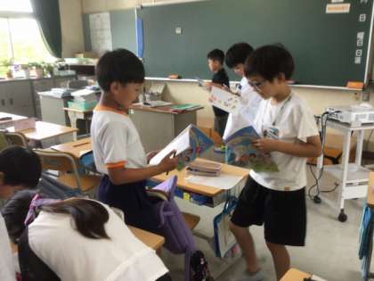 6/16の学習では、教科書のりんごの絵を自分の好きな数だけ塗り、クラスの友達にHow many apples ?と尋ねて、自分と同じ数だけ塗ったお友達を探す活動をしていました。
