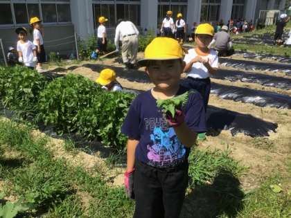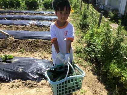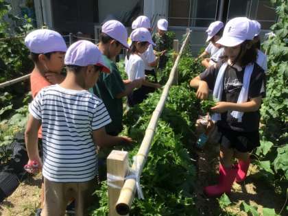 6/18のサツマイモの苗植えが終わった後、児童は野菜畑に行き、夏野菜の収穫を行いました。大きく育ったキュウリやピーマン、大葉が、かごいっぱいに採れました。