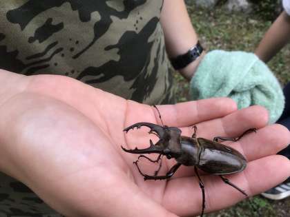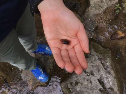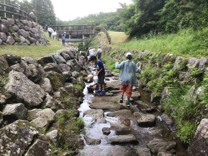 児童みんなの時間への意識が高く、少し自然に触れ合える時間ができたので、宿泊棟横の小川で生き物の観察を行いました。サワガニがいました。ミヤマクワガタも飛んで来ました。