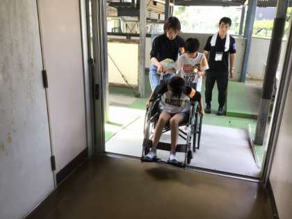 体育館の体験が終わった児童は、いよいよ体育館を出て、校内での体験に入りました。校内はほぼ平坦でスロープもあるのですが、ちょっとした段差もあって、児童にとっては普段感じなかったことに気付く機会となりました。