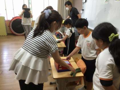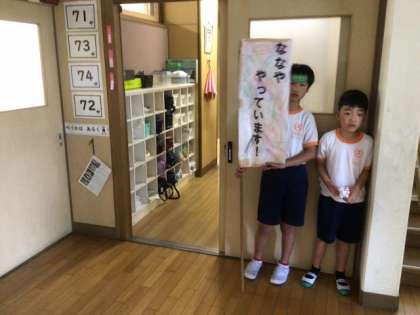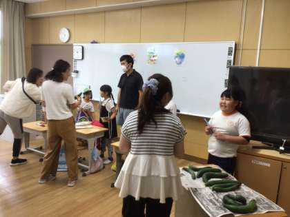 特別支援学級2〜6年生は、5月に夏野菜の苗を植えました。今回は最近収穫が始まったキュウリを売ることにしました。お店の名前は、昨年度特別支援学級児童が決めた「ななや」です。