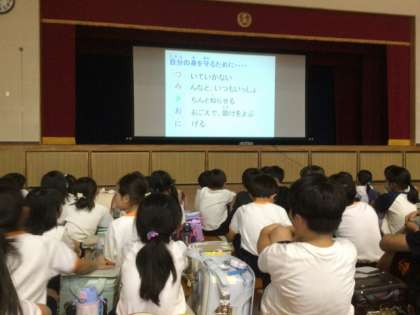 また、自分の身を守るための合言葉「つみきおに」を教わりました。「ついていなかい」「みんなといつもいっしょ」「きちんと(帰る時刻を)知らせる」「大声で助けを呼ぶ」「逃げる」の頭文字を合わせた言葉で、児童は大きな声でこの5つを言いました。