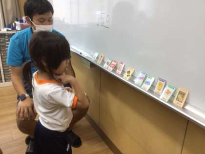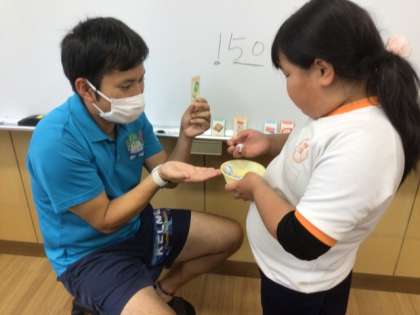 児童はお椀一杯分の紙幣と硬貨(模型)をもち、ホワイトボードに並ぶ商品を選んで会計に進みました。値段にみあうだけのお金を払っていました。
