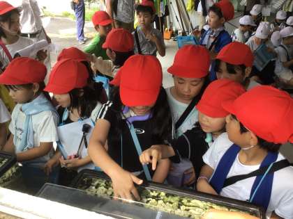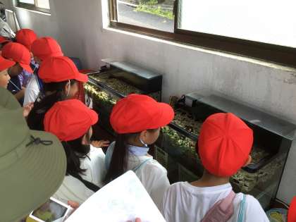 幼虫の観察が終わると、次はホタルの幼虫のエサとなるカワニナの観察を行いました。「カワニナは、ジャガイモやリンゴ、バナナも食べるよ」と聞いた児童は、「え〜〜〜〜〜」と、驚いていました。
