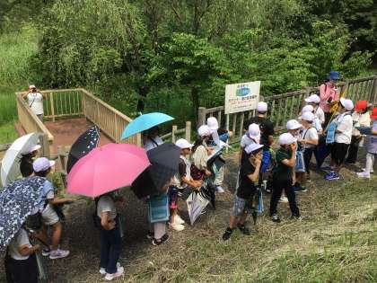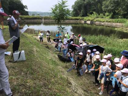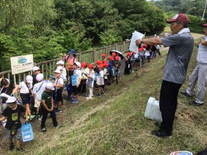 見学学習の最後は、ホタルの幼虫の放流地を見学しました。唐池の北側に、そのまた北側の池から水が流れ込む小川があり、その小川に大きく育てた幼虫を放流するということを学びました。ホタルが幼虫→さなぎ→成虫へと羽化するには、豊かな自然が大切なのだということを、児童は学びました。