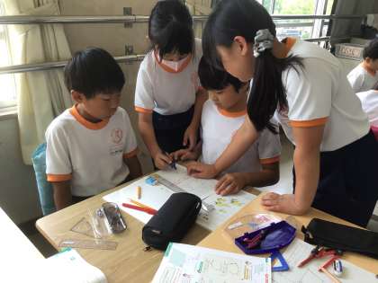 7/3の学習では、既習事項を使って平行四辺形を描きました。分度器を使って、70度の角を作り、長さを測りとりました。それぞれの辺の先端から、向かい合う辺と同じ長さ分をコンパスで測りとり、その交点をそれぞれ結んで平行四辺形を完成させました。友だちが描いた平行四辺形をじっくりと見て、平行四辺形になっているかを確認していました。