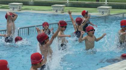 待ちに待ったプール開きがやってきました。とくに1年生は,小学校の広いプールは初めてで,歓声を上げていました。(写真は1年生の様子です。)