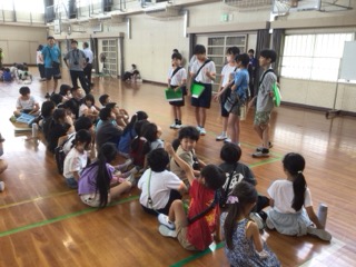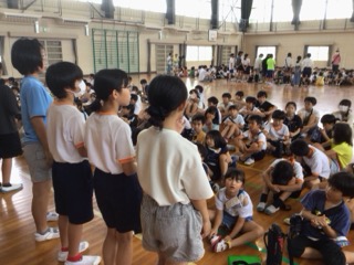 ゲームタイムが終了すると体育館に全員が集まり、各班で振り返りを行いました。自分が頑張ったことや、お友達が頑張ったことを発表しました。