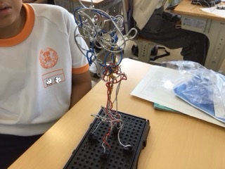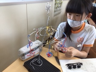 7/10の授業では、自分が描いた設計図を見ながら、はり金を曲げたり、からませたりしながら立体作品を作っていました。