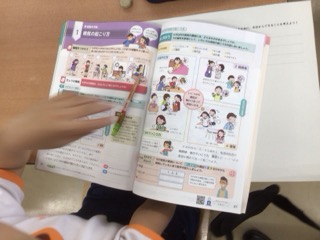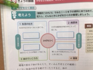 7/10の授業では、養護教諭が6年生児童に対して授業を行いました。教科書の図を参考にして、かぜなどの病気は「生活の仕方」「病原体」「体の抵抗力」「環境」のうち、いくつかの要因がかかわりあって病気になることを学びました。児童は、かぜにかからないようにするには、どうしたらよいかを考えあっていました。