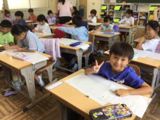 7/14の授業では、児童は初めて詩の書き方を学習しました。「詩は、お話をしているように書くんだよ」と習いました。児童はさっそく、書きたいことを探していました。