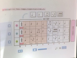 7/14の授業では、ボイスアンサンブルの発表会を行いました。発表会までに、班ごとに集まって教科書についているQRコードを読み取り、アプリ上で自分の好きなリズムを作りました。それを友達のリズムと組み合わせて、リズム打ちの楽譜を作りました。その楽譜を見ながら、自分のパートを声でリズム打ちして合わせる練習を積み重ね、発表会を迎えました。