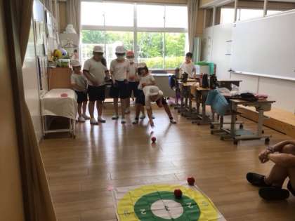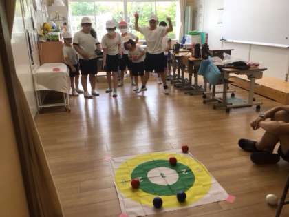 特別支援学級の体育では、「ボッチャ」に挑戦しました。ねらったところにピタリとボールを止めるために、上級生が下級生に投げ方を教えていました。ねらいどおりにボールが止まると、みんな大喜びしていました。