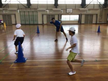 高学年チームは、4つのコーンを立て、その周りを一方向にまわりながらの鬼ごっこを行いました。