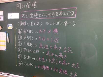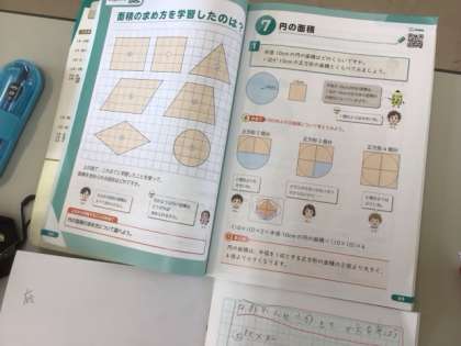 9/1の学習では、長方形、正方形、三角形などの面積の求め方を復習したのち、円の面積の求め方を考えていきました。