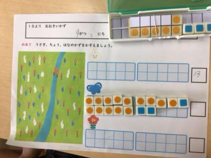 9/2の学習では、イラストにある「うさぎ」「ちょう」「はな」の数をかぞえました。数える時に数図ブロックを使って、10ぴきといくつかに分けて数えました。その2つを合わせて、13ひきと答えていました。