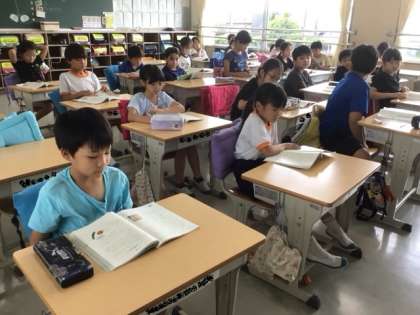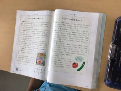 9/2の学習では、これからどのように学んでいくかを担任から聞いて、学習のながれをつかんでいました。担任の先生が「給食だより」が2つ載っているページを紹介して、この2つのどちらが伝わりやすいかを考えていくことになりました。