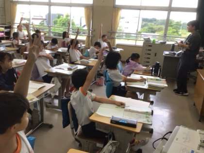 担任が数字カードを提示し、4人の児童が1枚ずつ引いて4つの数字で2桁の数字を2つ作ってひき算の問題にして、みんなで暗算をしていました。