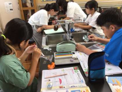 9/8の授業では、アサガオの花をたてに切って、断面を虫眼鏡で観察しました。