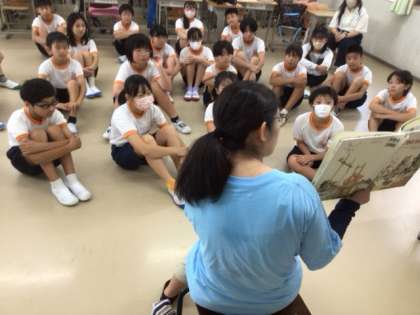 学校中の児童が、絵本の世界を楽しむすばらしい時間となっています。