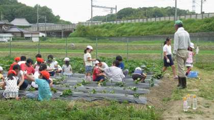 野菜名人のお世話で,1年生は生活科,6年生は総合的な学習の時間を使って,一緒にサツマイモの苗の植え付けをしました。