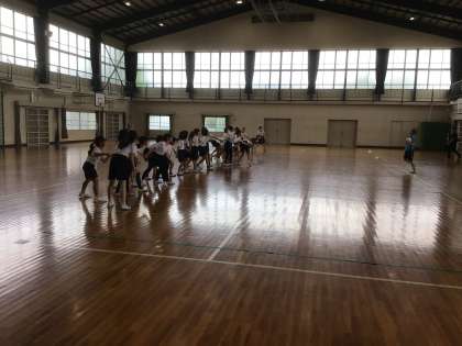 授業の最初に体育館で講師さんがウルトラマラソンのペースで走り、児童も一緒に走りました。また、ボールを使った「だるまさんが転んだ」も、一緒に楽しみました。