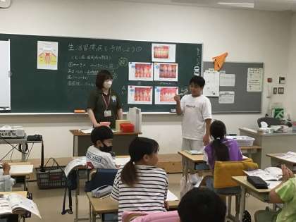 9/17は養護教諭が、生活習慣病を防ぐための正しい歯の磨き方についての授業を行いました。養護教諭が、大きな歯ブラシを取り出すと、児童の目が輝きました。正しい歯ブラシの持ち方を尋ねると、児童が教室の前に出て、お手本を見せました。