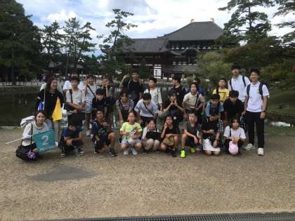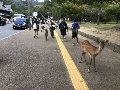 2番目の見学地は東大寺です。バスターミナルから歩いて東大寺に向かうと、鹿がお出迎えしてくれました。