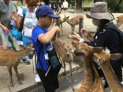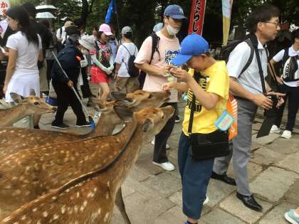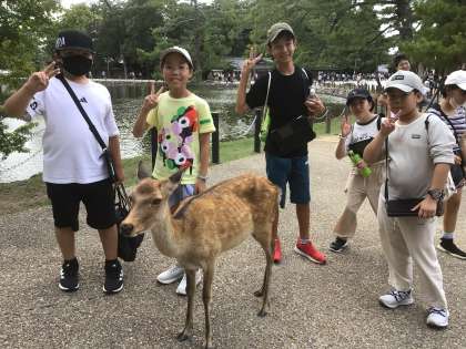 大仏殿を出て、班行動をしました。鹿せんべいを買ってあげる子もいました。多くの鹿に囲まれて、児童はびっくりしていました。