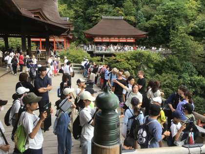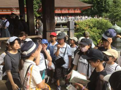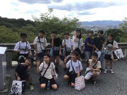 各班それぞれ選択した見学地での学習を終え、13時過ぎに清水寺駐車場に到着しました。そこからおみやげを買いながら、清水寺を目指して坂道を登って行きました。クラス写真を撮ったあと、最後の見学地、清水寺を見学しました。