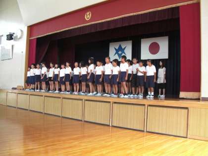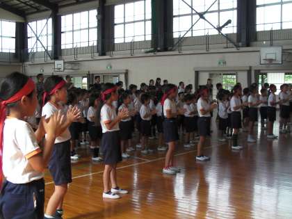 7月8日に,水泳部,フットサル部,ミニバスケット部の大会に向けて,壮行会が行われました。4年生を中心に全校児童が応援を披露した後,選手代表から力強い決意の言葉発表がありました。選手のみなさんは,全力で大会に臨んでくれるものと信じています。