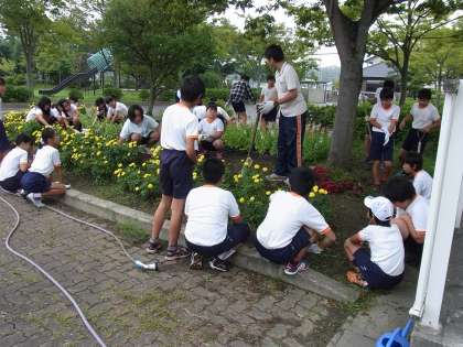 FF会の皆さんのご指導で種から育ててきた苗が大きくなりました。6年生が学校の花壇に植え付け、花いっぱいにしてくれました。