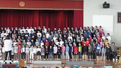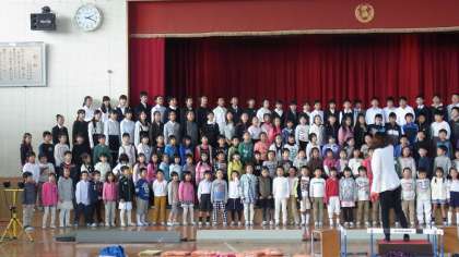 毎年、全校で一つのものを作り上げようとチャレンジしている全校合唱。これまでしっかりと練習を重ねてきたので、今年もきれいな歌声を披露できました。全校の1年生から6年生までの208人が、それぞれの学年でパートを受け持ち、声を合わせて合唱を作り上げることは、子どもたちにとっては、全校でやり遂げたという達成感を味わうのに、とてもよい取り組みになりました。