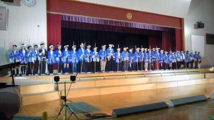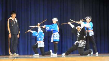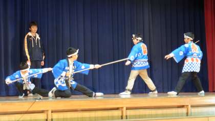 この地域に伝わる棒の手を、伊保小4年生から6年生までの伝統芸能クラブのみんなが、披露しました。2人一組となって、クラブの全員が普段の練習の成果を発揮して、棒の手の型を演じました。力強く迫力のある演技ができるようになったのも、地域講師の皆さんのご指導のたまものです。