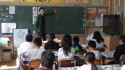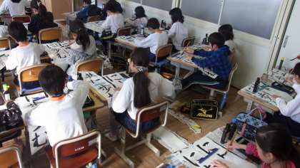 豊田書道連盟の安藤尤京先生を講師にお招きして、各学級で書き初めの指導会が行われました。専門家により適切なご指導をいただくことで、子どもたちも気をつけるところがよくわかったようです。