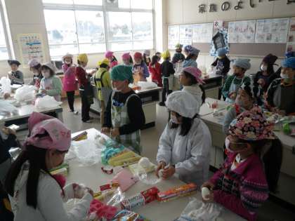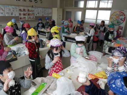 秋に、5年生と一緒に稲刈りを行いました。そのときに収穫したお米を使って、おにぎりづくりをしました。子どもたちはご飯を型で抜いたり、三角や丸の形に握ったりしながら、おにぎりづくりを楽しんでいました。そして作ったおにぎりをフレンド班での会食(お弁当)で食べました。自分たちで苦労して収穫しただけに、おいしさも格別のようでした。