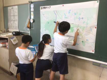 9/22の授業では、この地域にいる生き物についてまとめ、生き物マップを作っていました。学習用タブレットの校区の地図に、⭕️や🔺の記号を使ってカブトムシなどの昆虫マップを作っている子もいました。