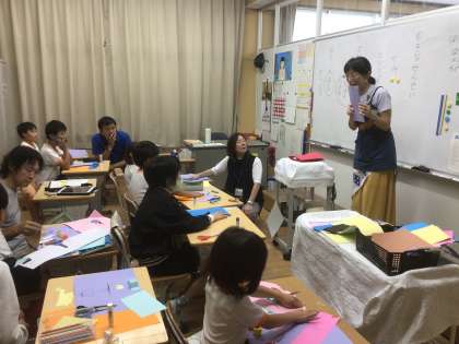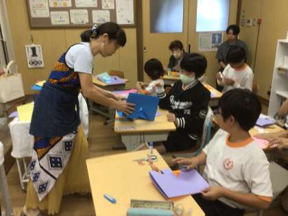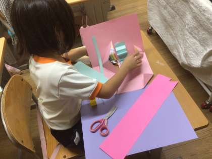 説明を聞きながら画用紙を切り、貼り付けて飛び出す絵本を作っていました。