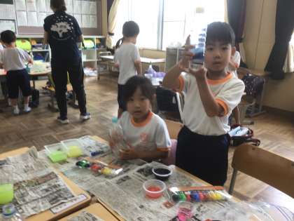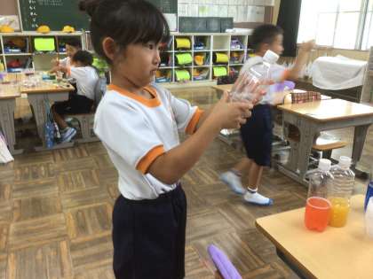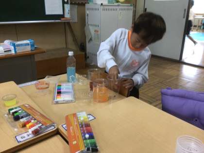 10/1の授業では、担任の先生から色水の作り方を教わりました。最初は単色の色水を作りました。次に、色を混ぜて、自分のお気に入りの色水を作りました。