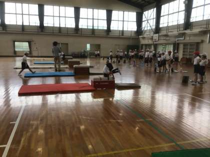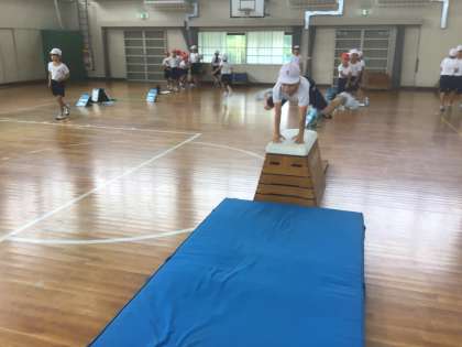 10/1の学習では、開脚跳びと台上前転に挑戦していました。開脚跳びでは、手をつく位置に気をつけていました。台上前転では、垂直に体が持ち上がるように踏み切り、すばやく体を丸めて台上で回れるよう練習をしていました。