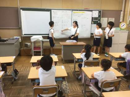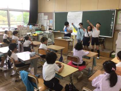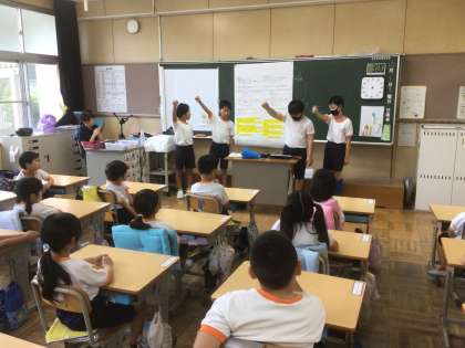 10/1の朝、応援実行委員の5、6年生が各学級をまわり、応援のセリフや振り付けを説明して回りました。説明のあと、応援練習を行いました。