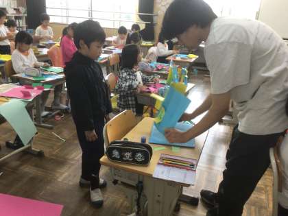 2年生の図工では、まどをあけたらという教材に取り組んでいます。先日は、たくさんの保護者ボランティアさんの支援をいただき、画用紙をカッターナイフで切り、窓を作りました。
