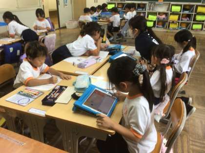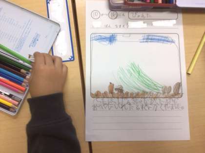 10/15の学習では、校庭で捕まえたバッタの観察を行いました。ワークシートにバッタの絵を描き、バッタの様子を文で書き表しました。