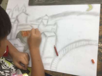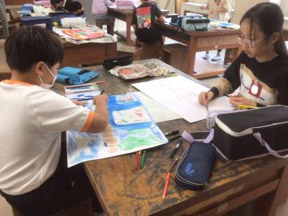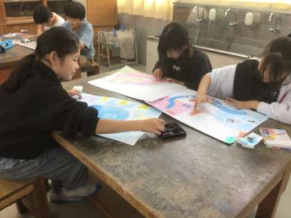 10/31の授業では、「どなたでもどうぞ」の読書感想画の仕上げに入っていました。背景にパステルを使い、やさしく、やわらかなお話の世界を描きました。