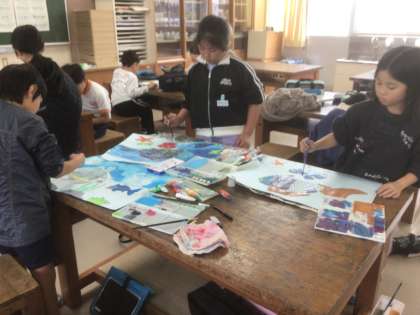 11/11の授業では、いよいよ仕上げを行いました。うろこを一つずつ丁寧に塗り分けたり、背景に色をつけたりしました。