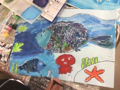 3年生の図工では、「にじいろの さかな」というお話を聞いて、読書感想画を描いています。